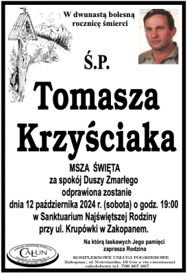 Podhale24.pl zastrzega sobie prawo do nie publikowania wspomnień, w szczególności tych nie związanych z profilem działu nekrologi, zawierających wulgaryzmy, wzywających do zachowań niezgodnych z prawem, obrażających osoby publiczne i prywatne, obrażających inne narodowości, rasy, religie itd, oraz te, bez możliwości telefonicznej lub mailowej weryfikacji ich autora.