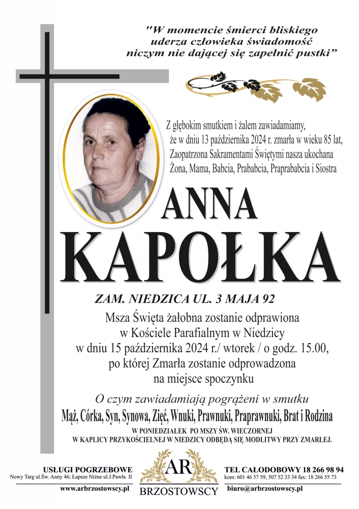 Podhale24.pl zastrzega sobie prawo do nie publikowania wspomnień, w szczególności tych nie związanych z profilem działu nekrologi, zawierających wulgaryzmy, wzywających do zachowań niezgodnych z prawem, obrażających osoby publiczne i prywatne, obrażających inne narodowości, rasy, religie itd, oraz te, bez możliwości telefonicznej lub mailowej weryfikacji ich autora.