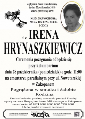 Podhale24.pl zastrzega sobie prawo do nie publikowania wspomnień, w szczególności tych nie związanych z profilem działu nekrologi, zawierających wulgaryzmy, wzywających do zachowań niezgodnych z prawem, obrażających osoby publiczne i prywatne, obrażających inne narodowości, rasy, religie itd, oraz te, bez możliwości telefonicznej lub mailowej weryfikacji ich autora.