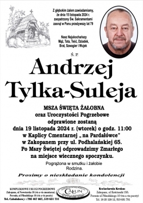 Podhale24.pl zastrzega sobie prawo do nie publikowania wspomnień, w szczególności tych nie związanych z profilem działu nekrologi, zawierających wulgaryzmy, wzywających do zachowań niezgodnych z prawem, obrażających osoby publiczne i prywatne, obrażających inne narodowości, rasy, religie itd, oraz te, bez możliwości telefonicznej lub mailowej weryfikacji ich autora.