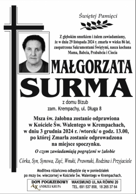 Podhale24.pl zastrzega sobie prawo do nie publikowania wspomnień, w szczególności tych nie związanych z profilem działu nekrologi, zawierających wulgaryzmy, wzywających do zachowań niezgodnych z prawem, obrażających osoby publiczne i prywatne, obrażających inne narodowości, rasy, religie itd, oraz te, bez możliwości telefonicznej lub mailowej weryfikacji ich autora.