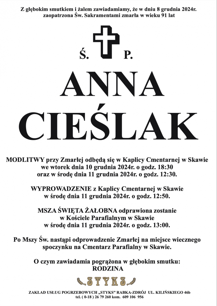Podhale24.pl zastrzega sobie prawo do nie publikowania wspomnień, w szczególności tych nie związanych z profilem działu nekrologi, zawierających wulgaryzmy, wzywających do zachowań niezgodnych z prawem, obrażających osoby publiczne i prywatne, obrażających inne narodowości, rasy, religie itd, oraz te, bez możliwości telefonicznej lub mailowej weryfikacji ich autora.