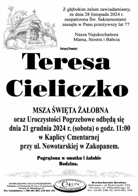 Podhale24.pl zastrzega sobie prawo do nie publikowania wspomnień, w szczególności tych nie związanych z profilem działu nekrologi, zawierających wulgaryzmy, wzywających do zachowań niezgodnych z prawem, obrażających osoby publiczne i prywatne, obrażających inne narodowości, rasy, religie itd, oraz te, bez możliwości telefonicznej lub mailowej weryfikacji ich autora.