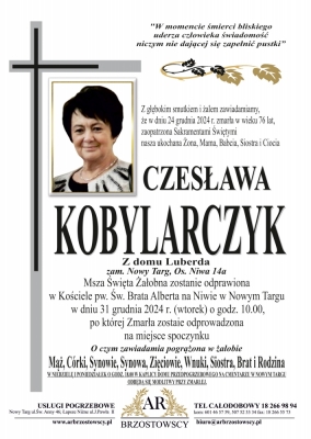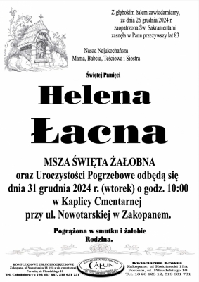 Podhale24.pl zastrzega sobie prawo do nie publikowania wspomnień, w szczególności tych nie związanych z profilem działu nekrologi, zawierających wulgaryzmy, wzywających do zachowań niezgodnych z prawem, obrażających osoby publiczne i prywatne, obrażających inne narodowości, rasy, religie itd, oraz te, bez możliwości telefonicznej lub mailowej weryfikacji ich autora.