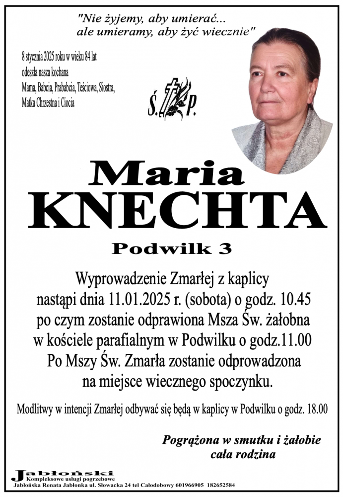 Podhale24.pl zastrzega sobie prawo do nie publikowania wspomnień, w szczególności tych nie związanych z profilem działu nekrologi, zawierających wulgaryzmy, wzywających do zachowań niezgodnych z prawem, obrażających osoby publiczne i prywatne, obrażających inne narodowości, rasy, religie itd, oraz te, bez możliwości telefonicznej lub mailowej weryfikacji ich autora.