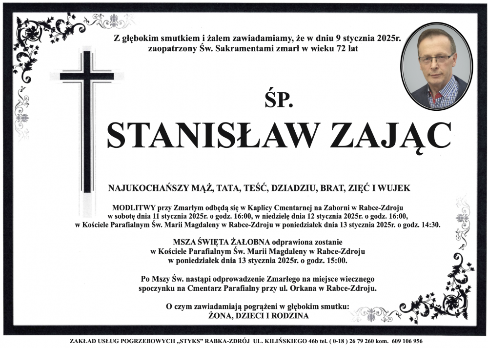 Podhale24.pl zastrzega sobie prawo do nie publikowania wspomnień, w szczególności tych nie związanych z profilem działu nekrologi, zawierających wulgaryzmy, wzywających do zachowań niezgodnych z prawem, obrażających osoby publiczne i prywatne, obrażających inne narodowości, rasy, religie itd, oraz te, bez możliwości telefonicznej lub mailowej weryfikacji ich autora.
