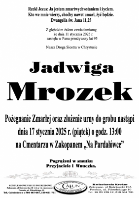 Podhale24.pl zastrzega sobie prawo do nie publikowania wspomnień, w szczególności tych nie związanych z profilem działu nekrologi, zawierających wulgaryzmy, wzywających do zachowań niezgodnych z prawem, obrażających osoby publiczne i prywatne, obrażających inne narodowości, rasy, religie itd, oraz te, bez możliwości telefonicznej lub mailowej weryfikacji ich autora.