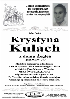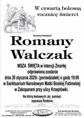 Podhale24.pl zastrzega sobie prawo do nie publikowania wspomnień, w szczególności tych nie związanych z profilem działu nekrologi, zawierających wulgaryzmy, wzywających do zachowań niezgodnych z prawem, obrażających osoby publiczne i prywatne, obrażających inne narodowości, rasy, religie itd, oraz te, bez możliwości telefonicznej lub mailowej weryfikacji ich autora.