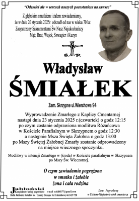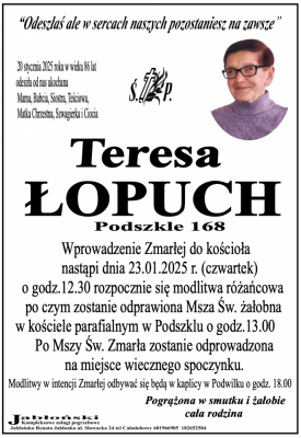 Podhale24.pl zastrzega sobie prawo do nie publikowania wspomnień, w szczególności tych nie związanych z profilem działu nekrologi, zawierających wulgaryzmy, wzywających do zachowań niezgodnych z prawem, obrażających osoby publiczne i prywatne, obrażających inne narodowości, rasy, religie itd, oraz te, bez możliwości telefonicznej lub mailowej weryfikacji ich autora.
