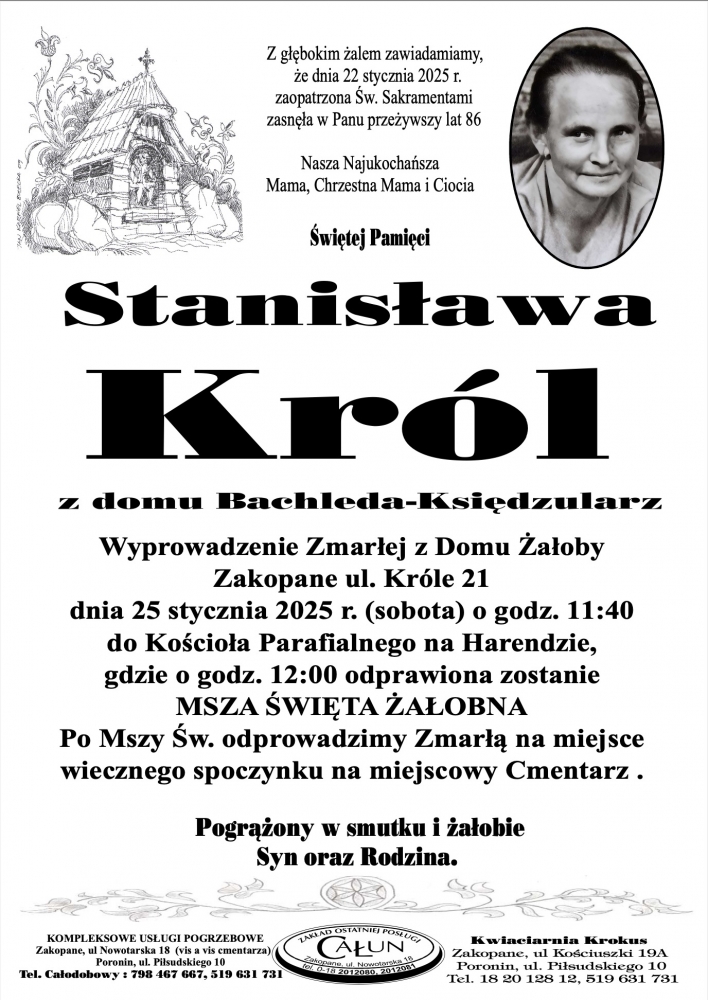 Podhale24.pl zastrzega sobie prawo do nie publikowania wspomnień, w szczególności tych nie związanych z profilem działu nekrologi, zawierających wulgaryzmy, wzywających do zachowań niezgodnych z prawem, obrażających osoby publiczne i prywatne, obrażających inne narodowości, rasy, religie itd, oraz te, bez możliwości telefonicznej lub mailowej weryfikacji ich autora.
