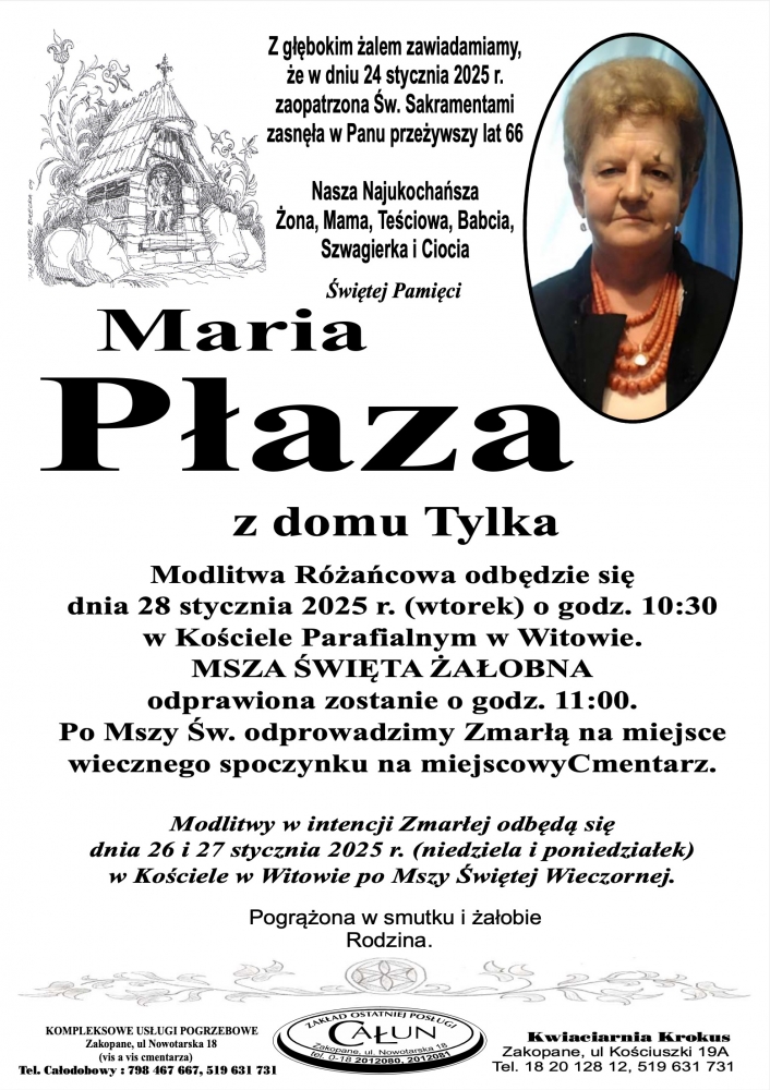 Podhale24.pl zastrzega sobie prawo do nie publikowania wspomnień, w szczególności tych nie związanych z profilem działu nekrologi, zawierających wulgaryzmy, wzywających do zachowań niezgodnych z prawem, obrażających osoby publiczne i prywatne, obrażających inne narodowości, rasy, religie itd, oraz te, bez możliwości telefonicznej lub mailowej weryfikacji ich autora.