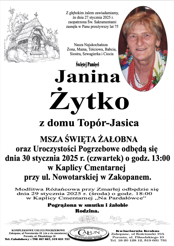 Podhale24.pl zastrzega sobie prawo do nie publikowania wspomnień, w szczególności tych nie związanych z profilem działu nekrologi, zawierających wulgaryzmy, wzywających do zachowań niezgodnych z prawem, obrażających osoby publiczne i prywatne, obrażających inne narodowości, rasy, religie itd, oraz te, bez możliwości telefonicznej lub mailowej weryfikacji ich autora.