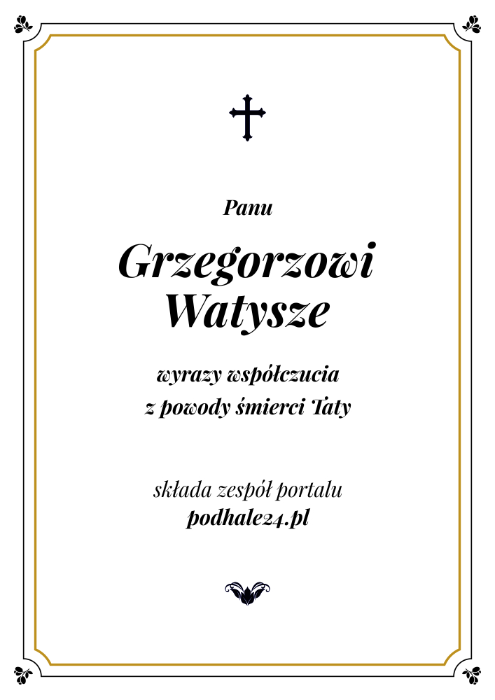 Podhale24.pl zastrzega sobie prawo do nie publikowania wspomnień, w szczególności tych nie związanych z profilem działu nekrologi, zawierających wulgaryzmy, wzywających do zachowań niezgodnych z prawem, obrażających osoby publiczne i prywatne, obrażających inne narodowości, rasy, religie itd, oraz te, bez możliwości telefonicznej lub mailowej weryfikacji ich autora.