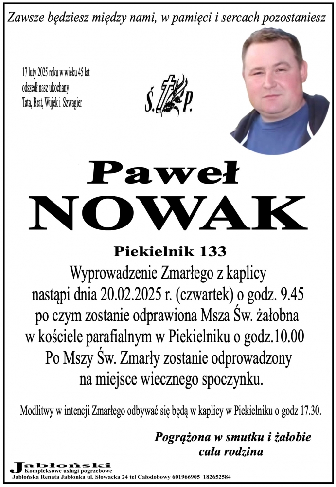Podhale24.pl zastrzega sobie prawo do nie publikowania wspomnień, w szczególności tych nie związanych z profilem działu nekrologi, zawierających wulgaryzmy, wzywających do zachowań niezgodnych z prawem, obrażających osoby publiczne i prywatne, obrażających inne narodowości, rasy, religie itd, oraz te, bez możliwości telefonicznej lub mailowej weryfikacji ich autora.