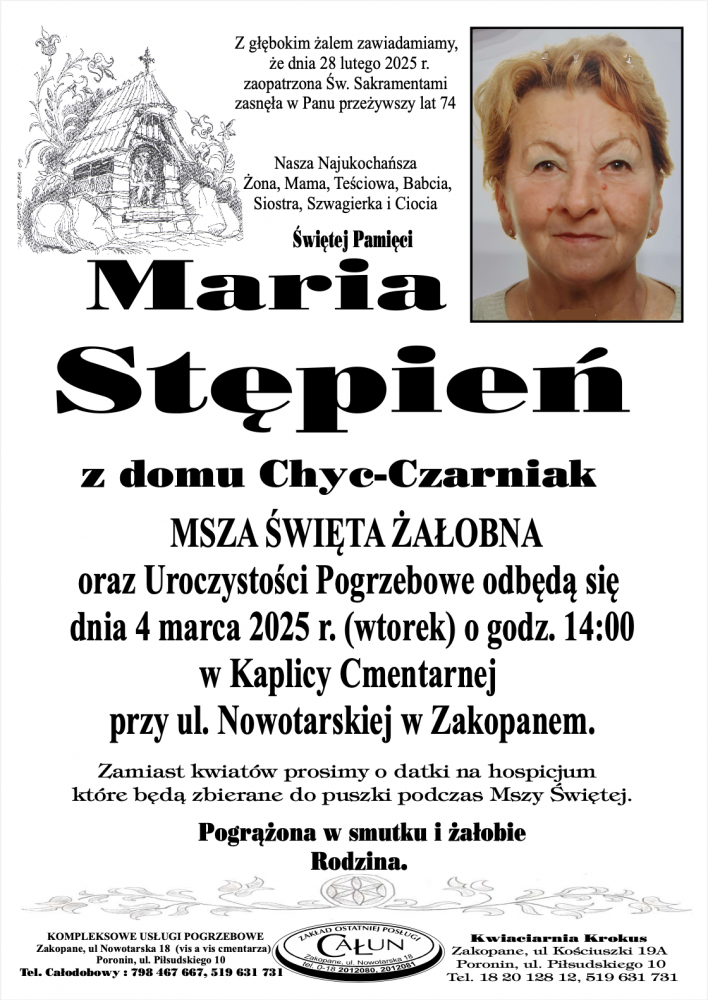 Podhale24.pl zastrzega sobie prawo do nie publikowania wspomnień, w szczególności tych nie związanych z profilem działu nekrologi, zawierających wulgaryzmy, wzywających do zachowań niezgodnych z prawem, obrażających osoby publiczne i prywatne, obrażających inne narodowości, rasy, religie itd, oraz te, bez możliwości telefonicznej lub mailowej weryfikacji ich autora.