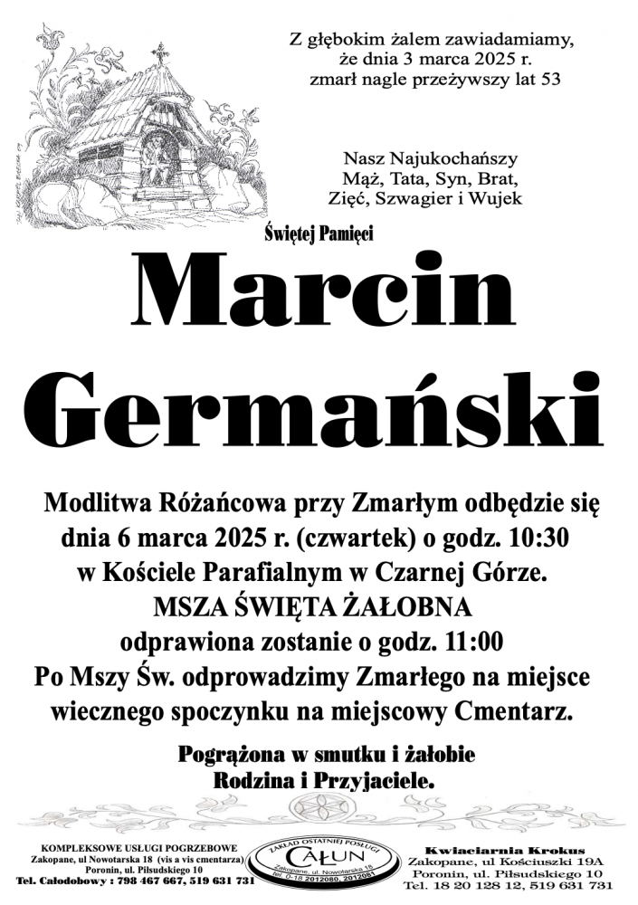 Podhale24.pl zastrzega sobie prawo do nie publikowania wspomnień, w szczególności tych nie związanych z profilem działu nekrologi, zawierających wulgaryzmy, wzywających do zachowań niezgodnych z prawem, obrażających osoby publiczne i prywatne, obrażających inne narodowości, rasy, religie itd, oraz te, bez możliwości telefonicznej lub mailowej weryfikacji ich autora.