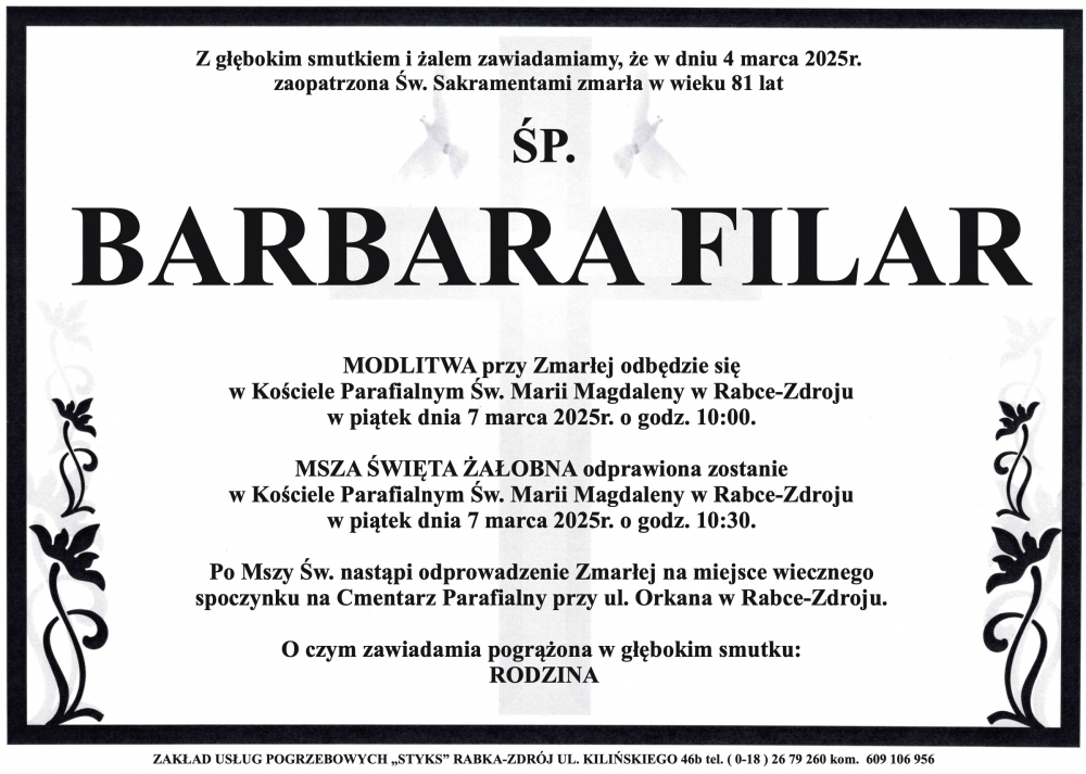 Podhale24.pl zastrzega sobie prawo do nie publikowania wspomnień, w szczególności tych nie związanych z profilem działu nekrologi, zawierających wulgaryzmy, wzywających do zachowań niezgodnych z prawem, obrażających osoby publiczne i prywatne, obrażających inne narodowości, rasy, religie itd, oraz te, bez możliwości telefonicznej lub mailowej weryfikacji ich autora.
