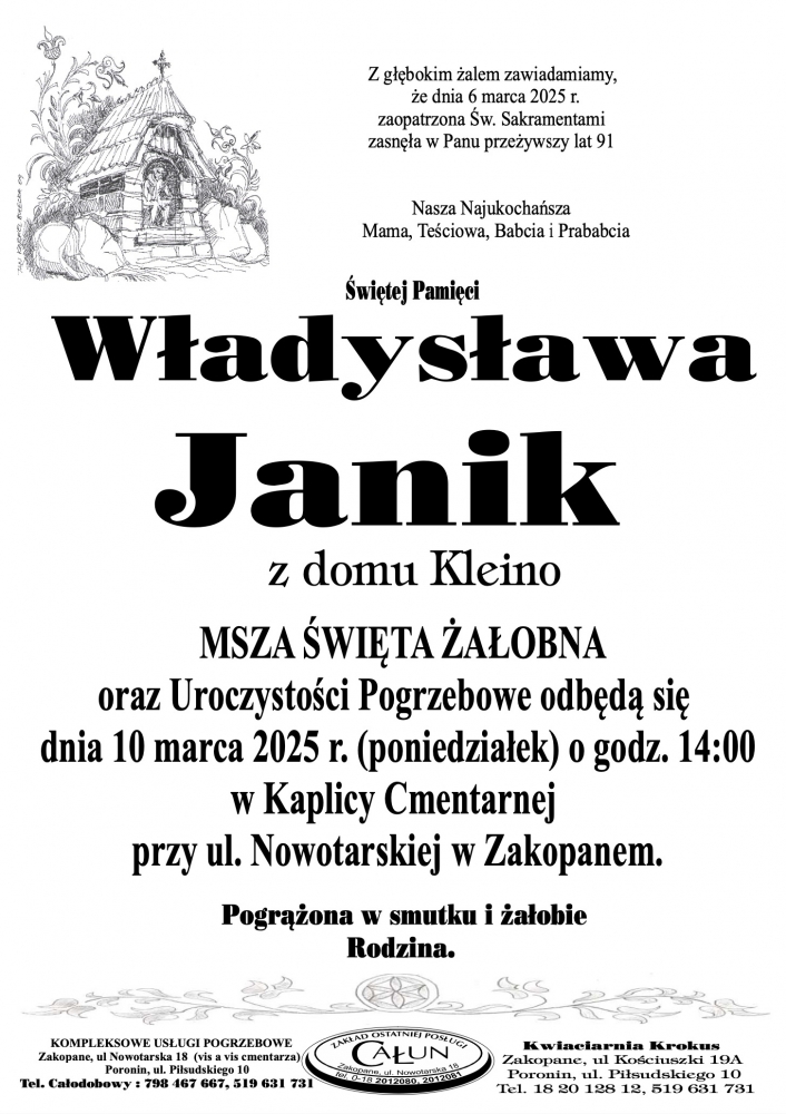 Podhale24.pl zastrzega sobie prawo do nie publikowania wspomnień, w szczególności tych nie związanych z profilem działu nekrologi, zawierających wulgaryzmy, wzywających do zachowań niezgodnych z prawem, obrażających osoby publiczne i prywatne, obrażających inne narodowości, rasy, religie itd, oraz te, bez możliwości telefonicznej lub mailowej weryfikacji ich autora.