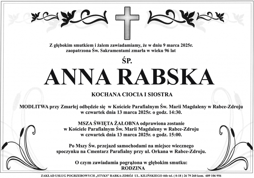 Podhale24.pl zastrzega sobie prawo do nie publikowania wspomnień, w szczególności tych nie związanych z profilem działu nekrologi, zawierających wulgaryzmy, wzywających do zachowań niezgodnych z prawem, obrażających osoby publiczne i prywatne, obrażających inne narodowości, rasy, religie itd, oraz te, bez możliwości telefonicznej lub mailowej weryfikacji ich autora.