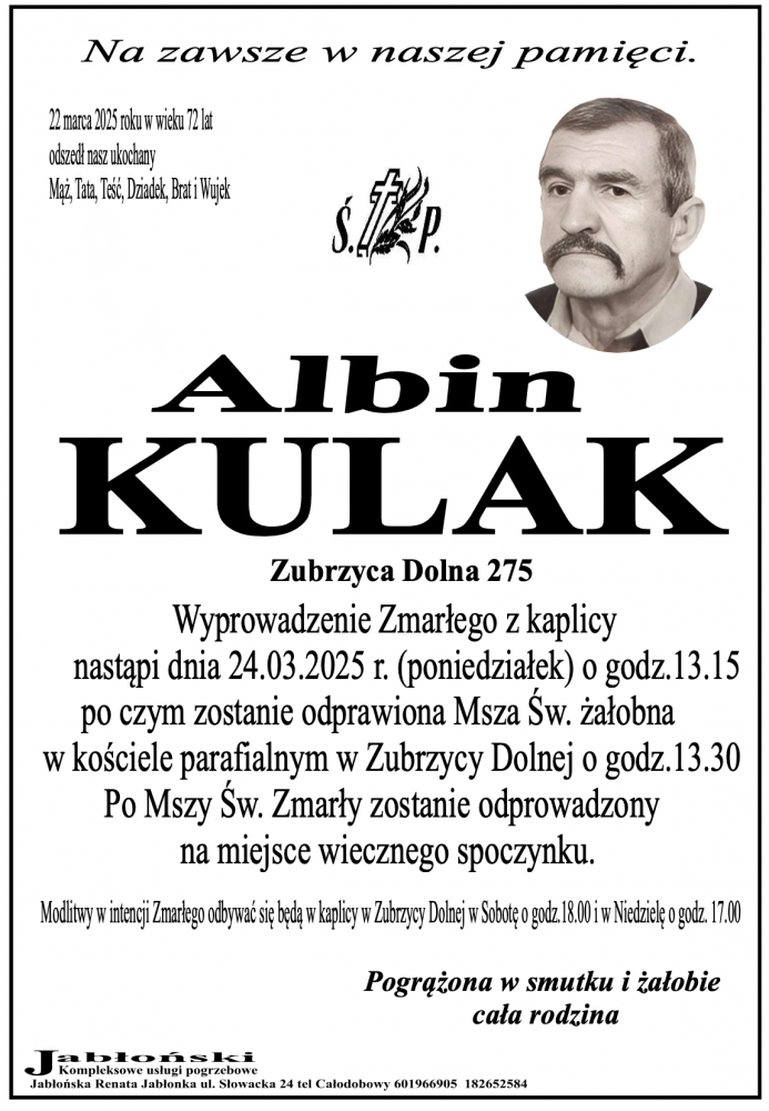 Podhale24.pl zastrzega sobie prawo do nie publikowania wspomnień, w szczególności tych nie związanych z profilem działu nekrologi, zawierających wulgaryzmy, wzywających do zachowań niezgodnych z prawem, obrażających osoby publiczne i prywatne, obrażających inne narodowości, rasy, religie itd, oraz te, bez możliwości telefonicznej lub mailowej weryfikacji ich autora.