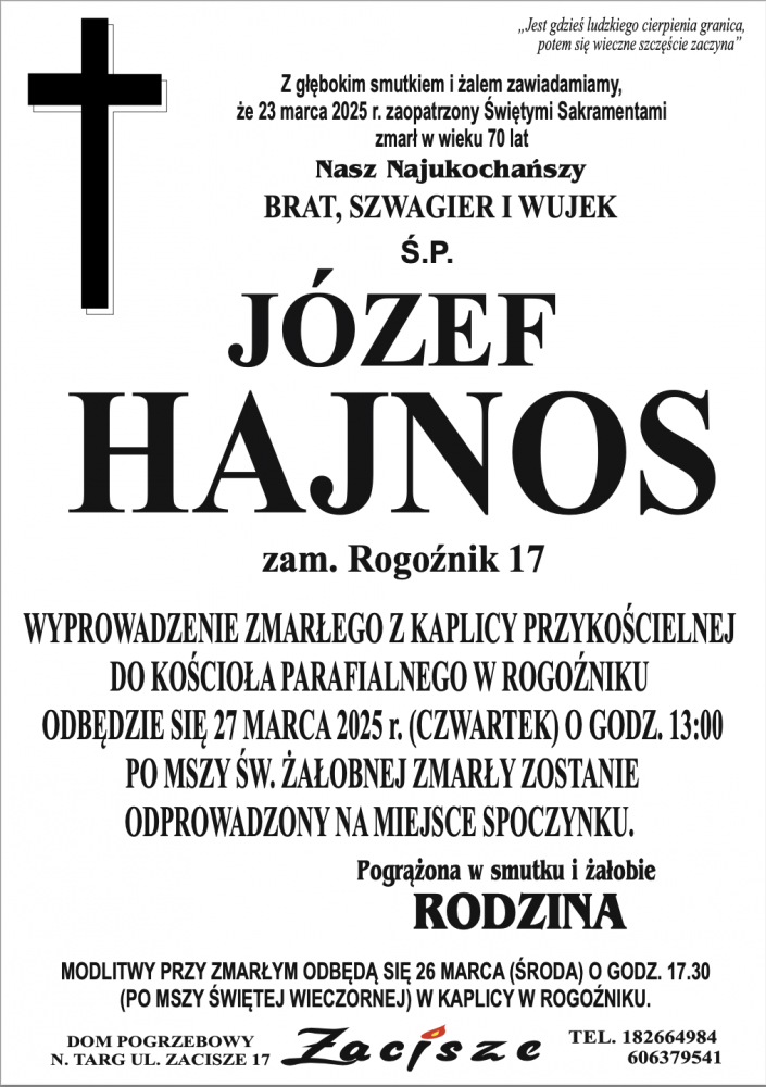 Podhale24.pl zastrzega sobie prawo do nie publikowania wspomnień, w szczególności tych nie związanych z profilem działu nekrologi, zawierających wulgaryzmy, wzywających do zachowań niezgodnych z prawem, obrażających osoby publiczne i prywatne, obrażających inne narodowości, rasy, religie itd, oraz te, bez możliwości telefonicznej lub mailowej weryfikacji ich autora.