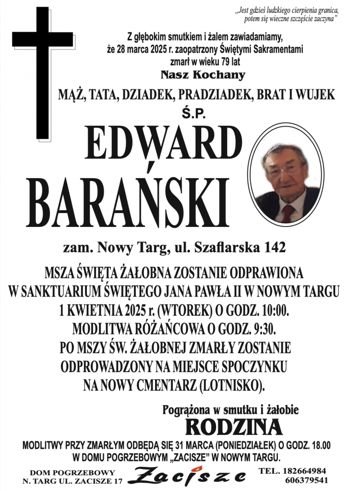 Podhale24.pl zastrzega sobie prawo do nie publikowania wspomnień, w szczególności tych nie związanych z profilem działu nekrologi, zawierających wulgaryzmy, wzywających do zachowań niezgodnych z prawem, obrażających osoby publiczne i prywatne, obrażających inne narodowości, rasy, religie itd, oraz te, bez możliwości telefonicznej lub mailowej weryfikacji ich autora.