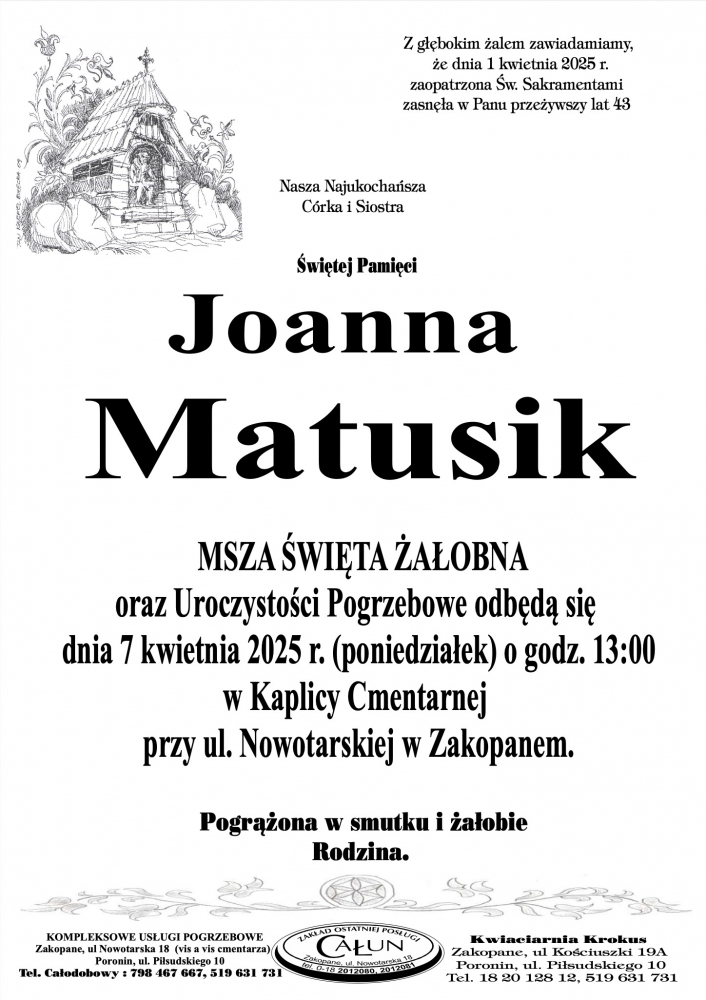 Podhale24.pl zastrzega sobie prawo do nie publikowania wspomnień, w szczególności tych nie związanych z profilem działu nekrologi, zawierających wulgaryzmy, wzywających do zachowań niezgodnych z prawem, obrażających osoby publiczne i prywatne, obrażających inne narodowości, rasy, religie itd, oraz te, bez możliwości telefonicznej lub mailowej weryfikacji ich autora.