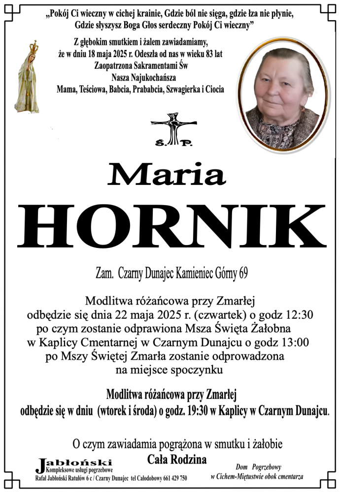 Podhale24.pl zastrzega sobie prawo do nie publikowania wspomnień, w szczególności tych nie związanych z profilem działu nekrologi, zawierających wulgaryzmy, wzywających do zachowań niezgodnych z prawem, obrażających osoby publiczne i prywatne, obrażających inne narodowości, rasy, religie itd, oraz te, bez możliwości telefonicznej lub mailowej weryfikacji ich autora.