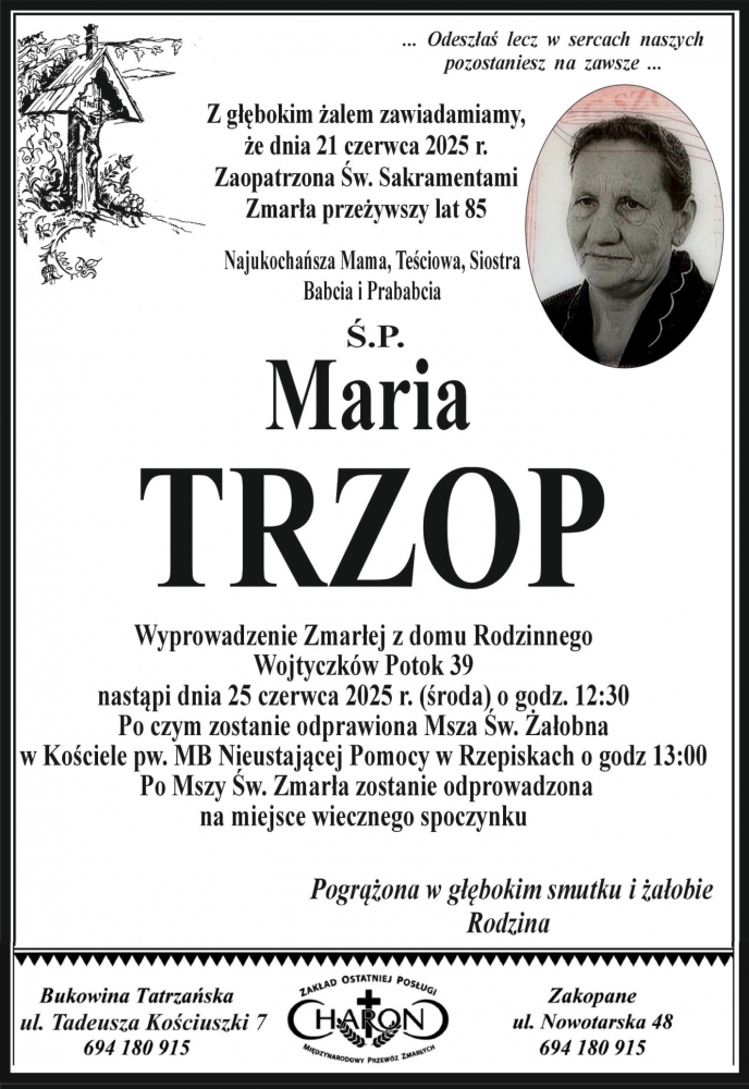 Podhale24.pl zastrzega sobie prawo do nie publikowania wspomnień, w szczególności tych nie związanych z profilem działu nekrologi, zawierających wulgaryzmy, wzywających do zachowań niezgodnych z prawem, obrażających osoby publiczne i prywatne, obrażających inne narodowości, rasy, religie itd, oraz te, bez możliwości telefonicznej lub mailowej weryfikacji ich autora.