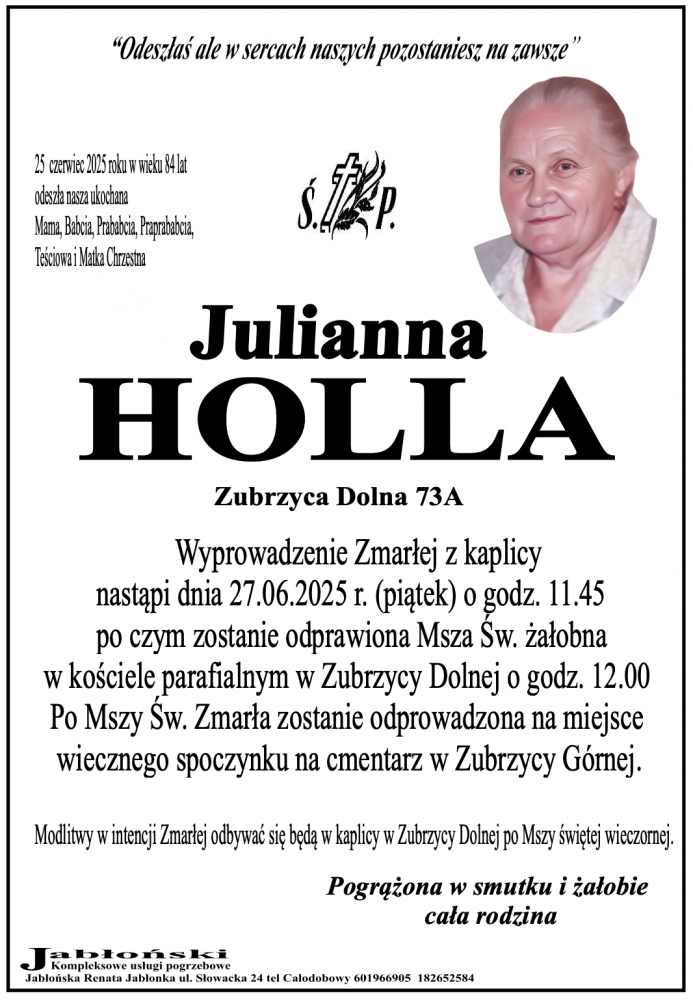 Podhale24.pl zastrzega sobie prawo do nie publikowania wspomnień, w szczególności tych nie związanych z profilem działu nekrologi, zawierających wulgaryzmy, wzywających do zachowań niezgodnych z prawem, obrażających osoby publiczne i prywatne, obrażających inne narodowości, rasy, religie itd, oraz te, bez możliwości telefonicznej lub mailowej weryfikacji ich autora.
