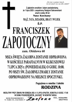 Podhale24.pl zastrzega sobie prawo do nie publikowania wspomnień, w szczególności tych nie związanych z profilem działu nekrologi, zawierających wulgaryzmy, wzywających do zachowań niezgodnych z prawem, obrażających osoby publiczne i prywatne, obrażających inne narodowości, rasy, religie itd, oraz te, bez możliwości telefonicznej lub mailowej weryfikacji ich autora.