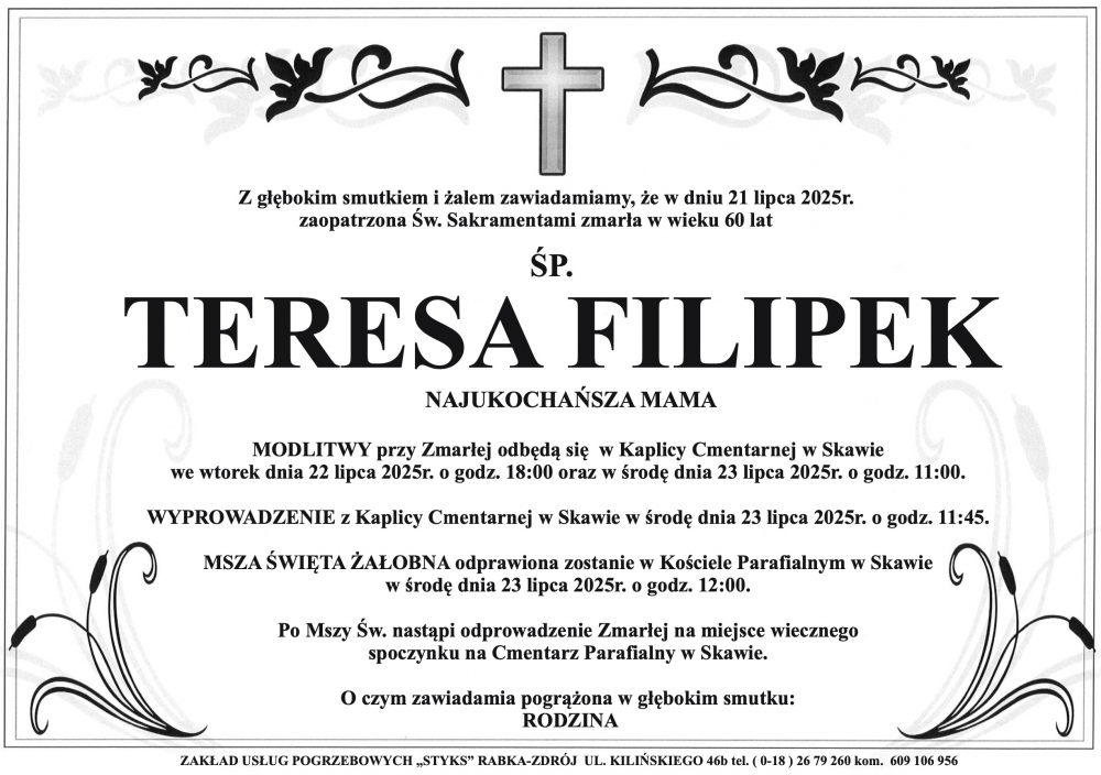 Podhale24.pl zastrzega sobie prawo do nie publikowania wspomnień, w szczególności tych nie związanych z profilem działu nekrologi, zawierających wulgaryzmy, wzywających do zachowań niezgodnych z prawem, obrażających osoby publiczne i prywatne, obrażających inne narodowości, rasy, religie itd, oraz te, bez możliwości telefonicznej lub mailowej weryfikacji ich autora.