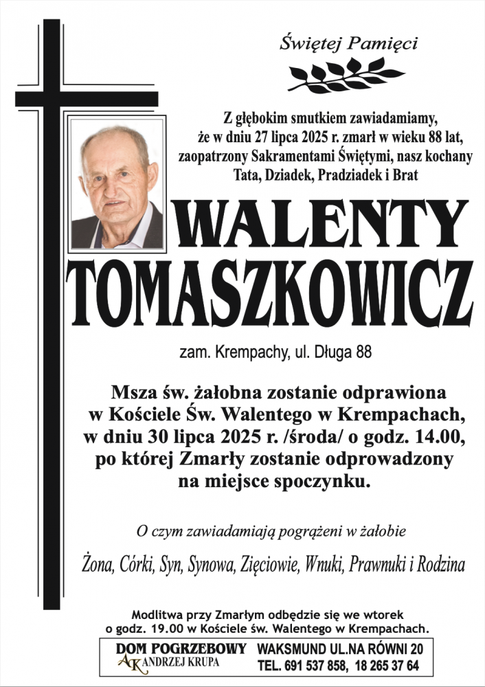 Walenty Tomaszkowicz - Nekrologi - podhale24.pl
