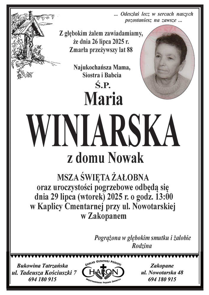 Podhale24.pl zastrzega sobie prawo do nie publikowania wspomnień, w szczególności tych nie związanych z profilem działu nekrologi, zawierających wulgaryzmy, wzywających do zachowań niezgodnych z prawem, obrażających osoby publiczne i prywatne, obrażających inne narodowości, rasy, religie itd, oraz te, bez możliwości telefonicznej lub mailowej weryfikacji ich autora.