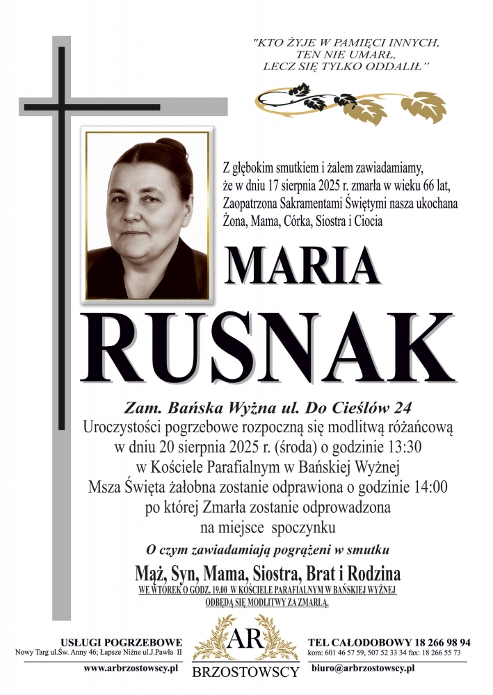 Podhale24.pl zastrzega sobie prawo do nie publikowania wspomnień, w szczególności tych nie związanych z profilem działu nekrologi, zawierających wulgaryzmy, wzywających do zachowań niezgodnych z prawem, obrażających osoby publiczne i prywatne, obrażających inne narodowości, rasy, religie itd, oraz te, bez możliwości telefonicznej lub mailowej weryfikacji ich autora.