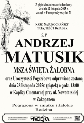 Podhale24.pl zastrzega sobie prawo do nie publikowania wspomnień, w szczególności tych nie związanych z profilem działu nekrologi, zawierających wulgaryzmy, wzywających do zachowań niezgodnych z prawem, obrażających osoby publiczne i prywatne, obrażających inne narodowości, rasy, religie itd, oraz te, bez możliwości telefonicznej lub mailowej weryfikacji ich autora.