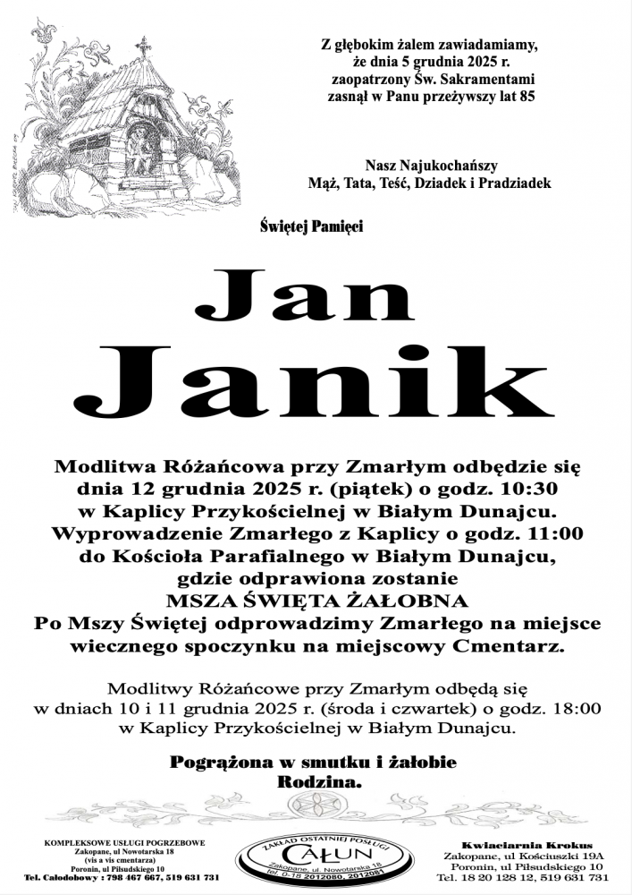 Podhale24.pl zastrzega sobie prawo do nie publikowania wspomnień, w szczególności tych nie związanych z profilem działu nekrologi, zawierających wulgaryzmy, wzywających do zachowań niezgodnych z prawem, obrażających osoby publiczne i prywatne, obrażających inne narodowości, rasy, religie itd, oraz te, bez możliwości telefonicznej lub mailowej weryfikacji ich autora.