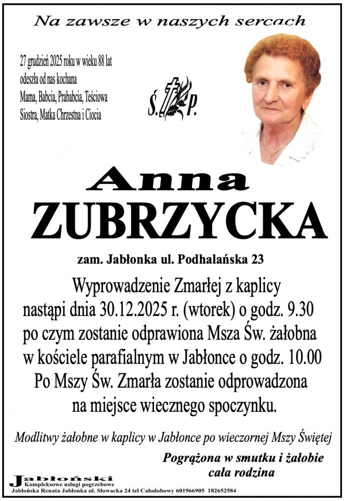 Anna Zubrzycka - Nekrologi - podhale24.pl