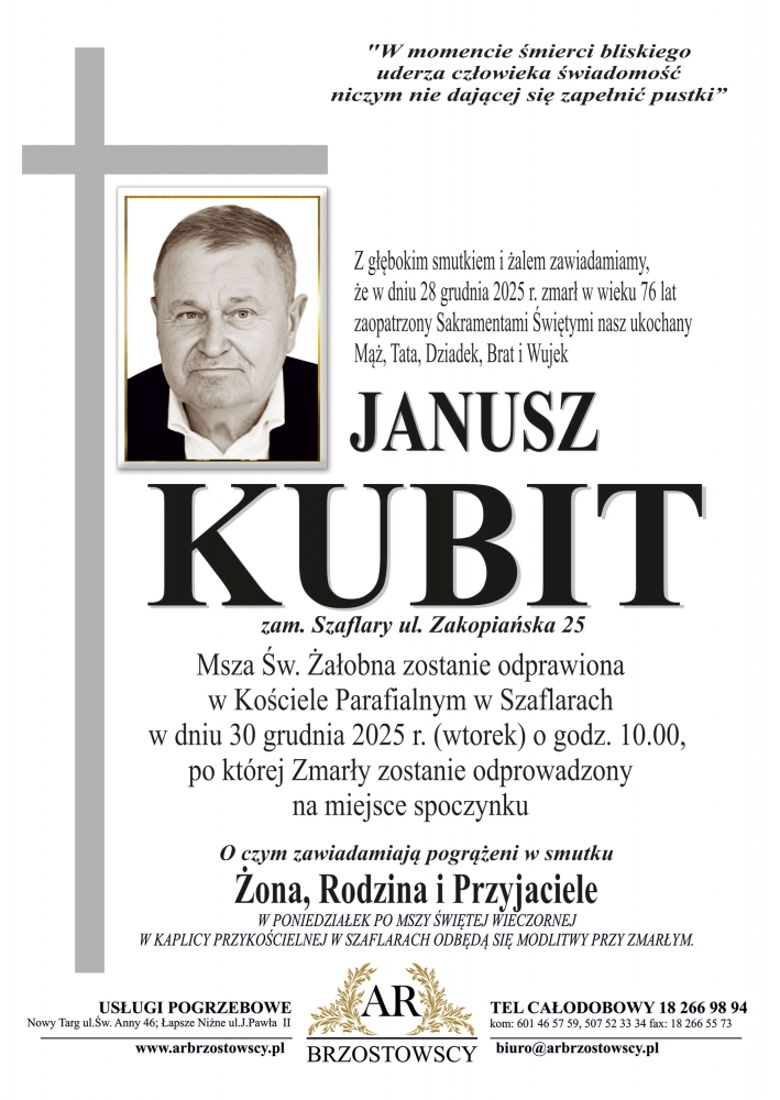 Podhale24.pl zastrzega sobie prawo do nie publikowania wspomnień, w szczególności tych nie związanych z profilem działu nekrologi, zawierających wulgaryzmy, wzywających do zachowań niezgodnych z prawem, obrażających osoby publiczne i prywatne, obrażających inne narodowości, rasy, religie itd, oraz te, bez możliwości telefonicznej lub mailowej weryfikacji ich autora.