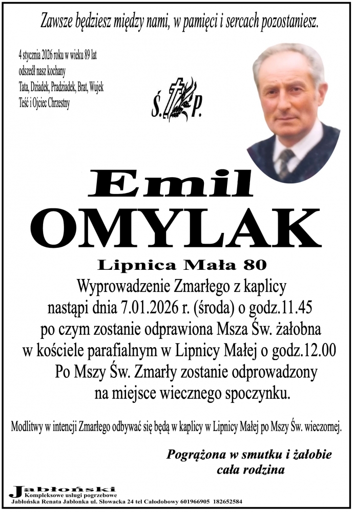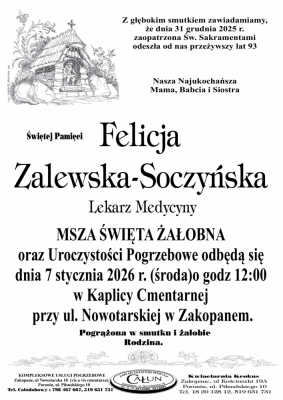 Podhale24.pl zastrzega sobie prawo do nie publikowania wspomnień, w szczególności tych nie związanych z profilem działu nekrologi, zawierających wulgaryzmy, wzywających do zachowań niezgodnych z prawem, obrażających osoby publiczne i prywatne, obrażających inne narodowości, rasy, religie itd, oraz te, bez możliwości telefonicznej lub mailowej weryfikacji ich autora.