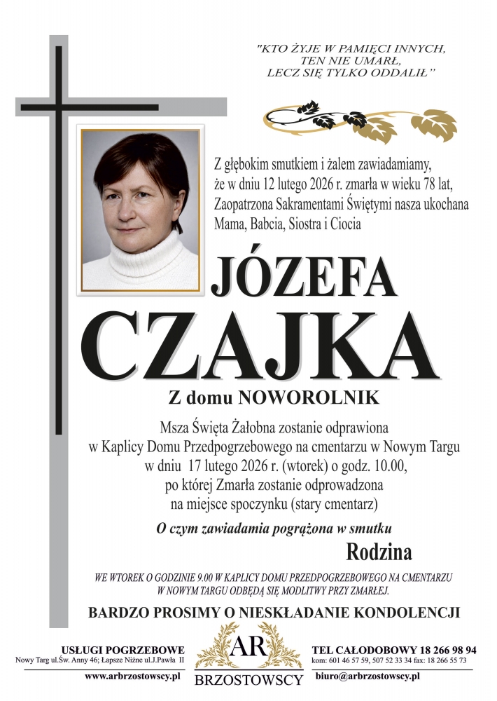 Podhale24.pl zastrzega sobie prawo do nie publikowania wspomnień, w szczególności tych nie związanych z profilem działu nekrologi, zawierających wulgaryzmy, wzywających do zachowań niezgodnych z prawem, obrażających osoby publiczne i prywatne, obrażających inne narodowości, rasy, religie itd, oraz te, bez możliwości telefonicznej lub mailowej weryfikacji ich autora.