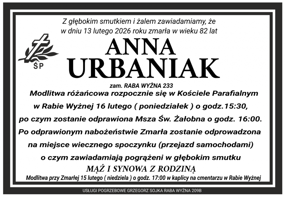 Anna Urbaniak - Nekrologi - podhale24.pl