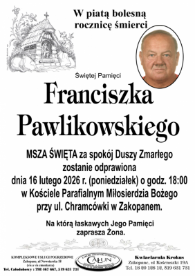 Podhale24.pl zastrzega sobie prawo do nie publikowania wspomnień, w szczególności tych nie związanych z profilem działu nekrologi, zawierających wulgaryzmy, wzywających do zachowań niezgodnych z prawem, obrażających osoby publiczne i prywatne, obrażających inne narodowości, rasy, religie itd, oraz te, bez możliwości telefonicznej lub mailowej weryfikacji ich autora.
