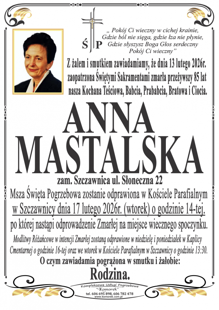 Podhale24.pl zastrzega sobie prawo do nie publikowania wspomnień, w szczególności tych nie związanych z profilem działu nekrologi, zawierających wulgaryzmy, wzywających do zachowań niezgodnych z prawem, obrażających osoby publiczne i prywatne, obrażających inne narodowości, rasy, religie itd, oraz te, bez możliwości telefonicznej lub mailowej weryfikacji ich autora.