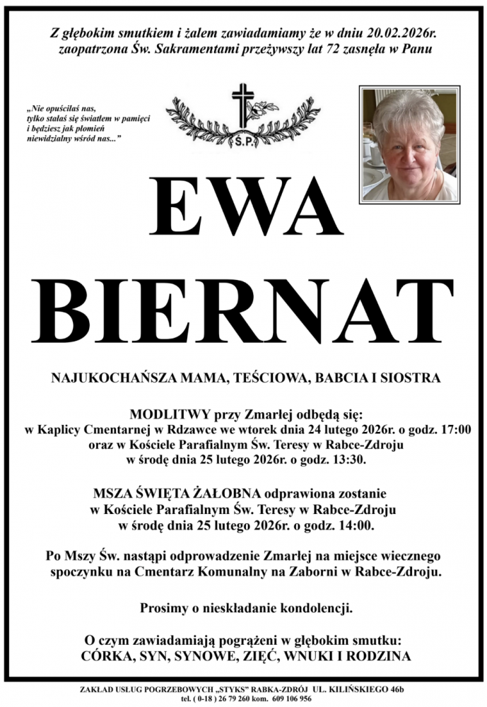 Podhale24.pl zastrzega sobie prawo do nie publikowania wspomnień, w szczególności tych nie związanych z profilem działu nekrologi, zawierających wulgaryzmy, wzywających do zachowań niezgodnych z prawem, obrażających osoby publiczne i prywatne, obrażających inne narodowości, rasy, religie itd, oraz te, bez możliwości telefonicznej lub mailowej weryfikacji ich autora.