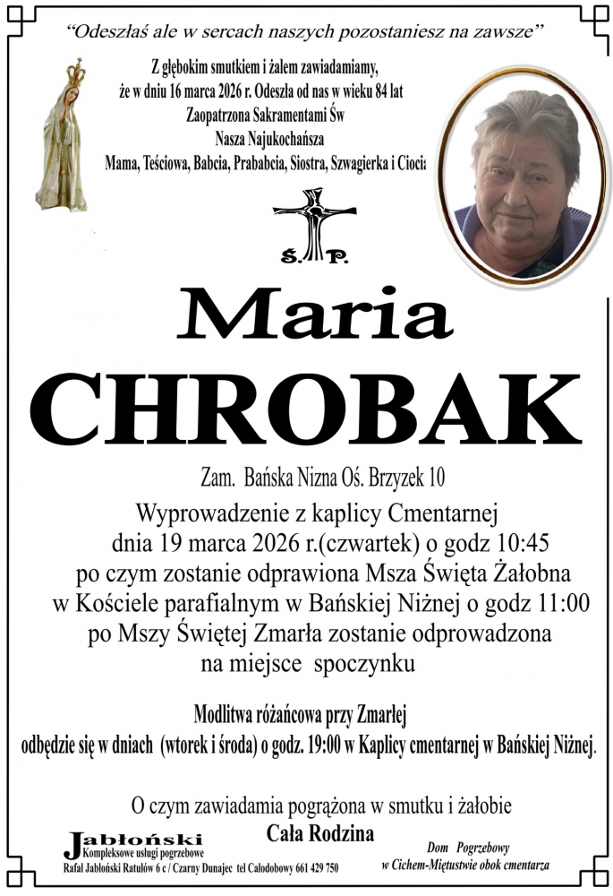 Podhale24.pl zastrzega sobie prawo do nie publikowania wspomnień, w szczególności tych nie związanych z profilem działu nekrologi, zawierających wulgaryzmy, wzywających do zachowań niezgodnych z prawem, obrażających osoby publiczne i prywatne, obrażających inne narodowości, rasy, religie itd, oraz te, bez możliwości telefonicznej lub mailowej weryfikacji ich autora.