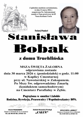 Podhale24.pl zastrzega sobie prawo do nie publikowania wspomnień, w szczególności tych nie związanych z profilem działu nekrologi, zawierających wulgaryzmy, wzywających do zachowań niezgodnych z prawem, obrażających osoby publiczne i prywatne, obrażających inne narodowości, rasy, religie itd, oraz te, bez możliwości telefonicznej lub mailowej weryfikacji ich autora.