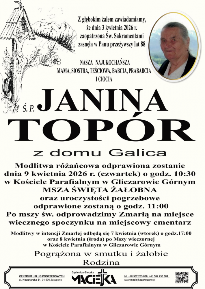 Podhale24.pl zastrzega sobie prawo do nie publikowania wspomnień, w szczególności tych nie związanych z profilem działu nekrologi, zawierających wulgaryzmy, wzywających do zachowań niezgodnych z prawem, obrażających osoby publiczne i prywatne, obrażających inne narodowości, rasy, religie itd, oraz te, bez możliwości telefonicznej lub mailowej weryfikacji ich autora.