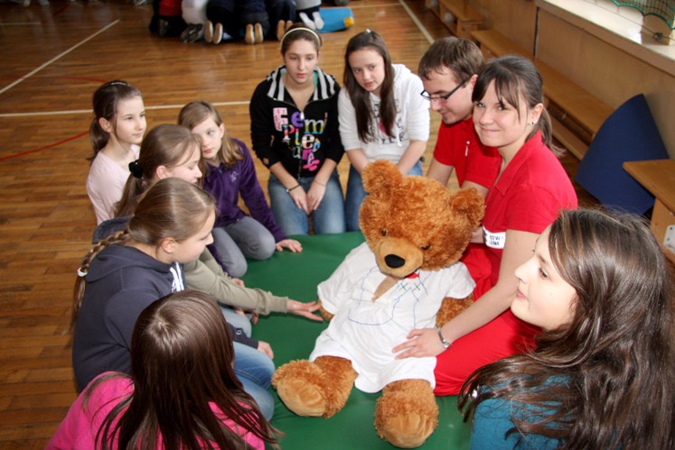 Uczniowie szkoły podzieleni na grupy przysłuchiwali się krótkiemu wykładowi studentów ratownictwa wzbogaconemu o prezentację komputerową na rzutniku. Potem studenci pokazali jak udziela się pierwszej pomocy w postaci resuscytacji krążeniowo-oddechowej (pośredni masaż serca i sztuczne oddychanie usta-usta), zaprezentowali zasadę działania defibrylatora automatycznego do przywracania akcji serca, a także poinstruowali jak działać w przypadku zakrztuszenia się lub ataku padaczki.